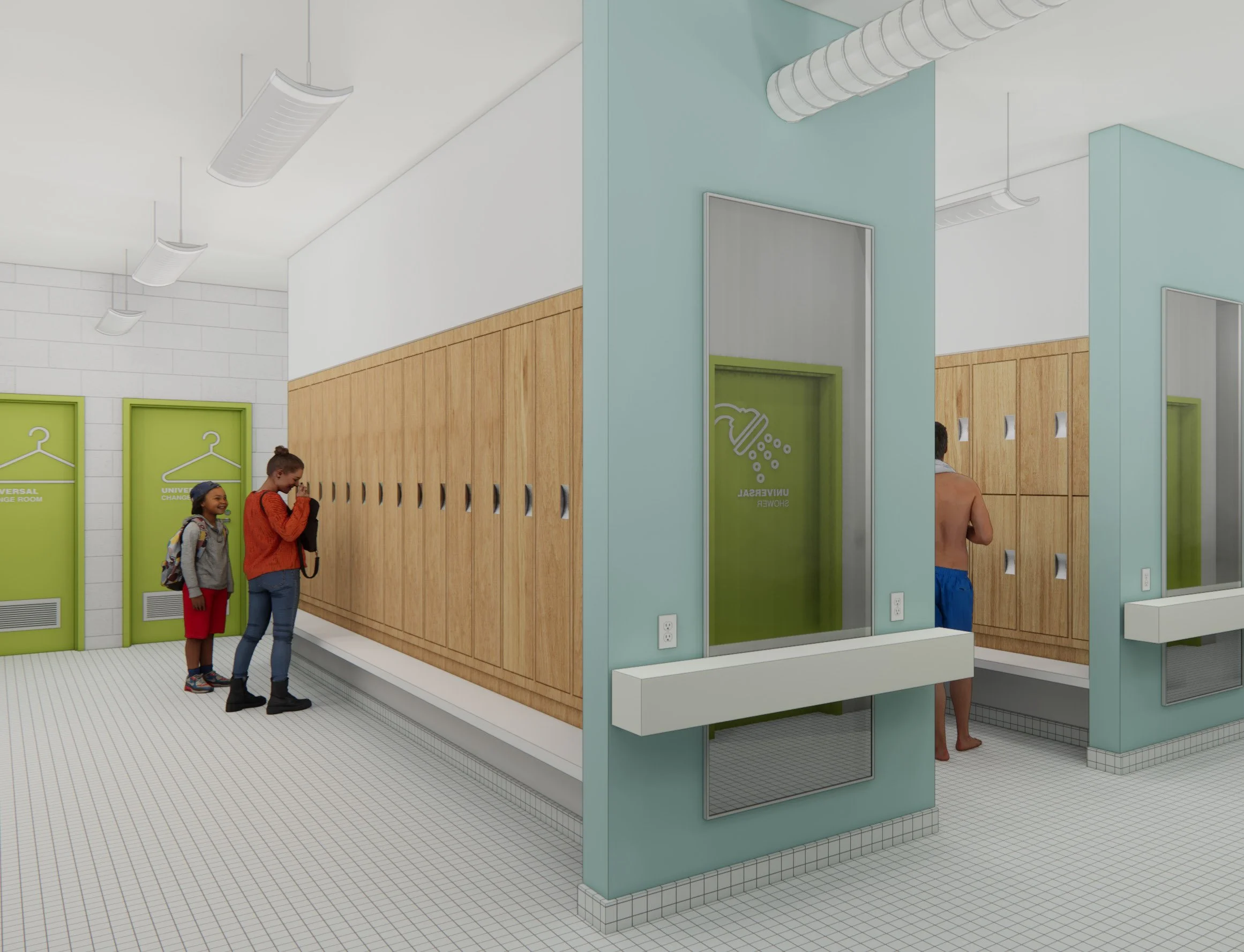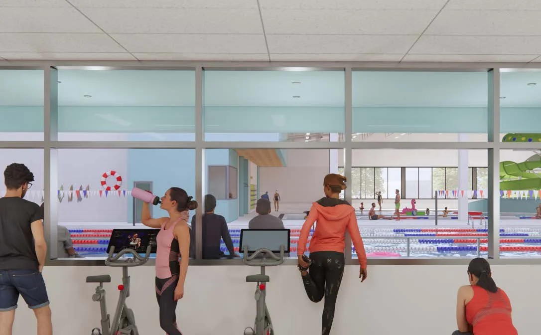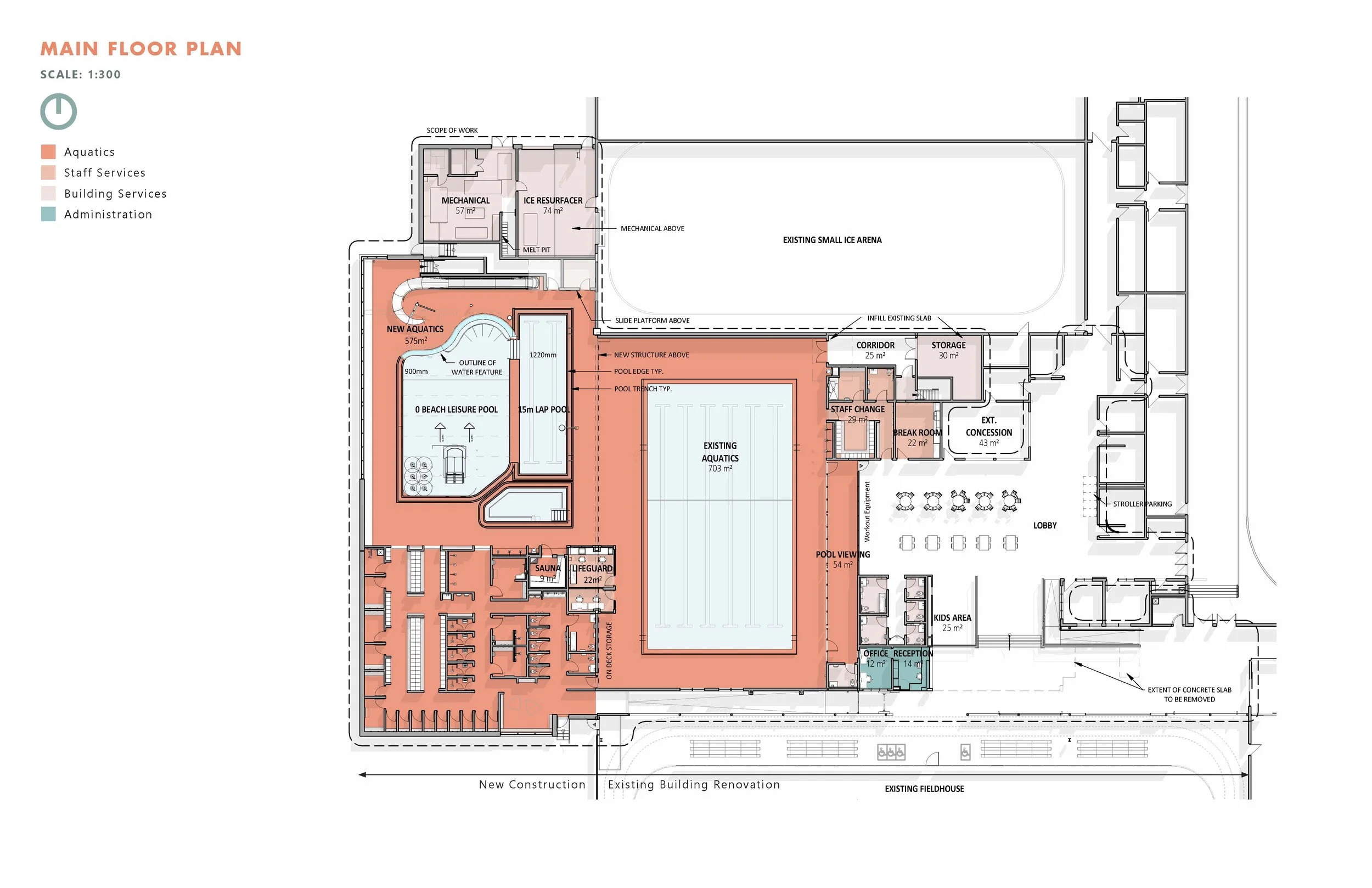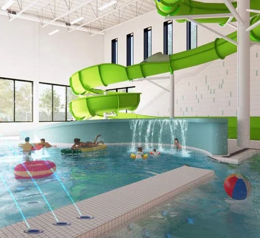 This project will provide us with an expanded year-round aquatics facility, complete with a beach entry leisure pool, waterslide, spray features, new hot tub, and a smaller lap pool for lessons, etc. The existing lane pool will remain. As well, the project includes a much-needed renovation to our reception and lobby area of the recreation centre.